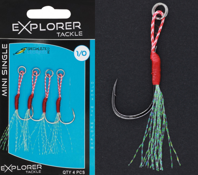 Assists hooks avec tinsel (filaments brillants) montés sur tresse 65lbs, spécialement prévu pour équiper vos casting jigs de 15gr à 60gr environ. (selon la taille du jig / voir caractéristiques des assists un peu plus bas).