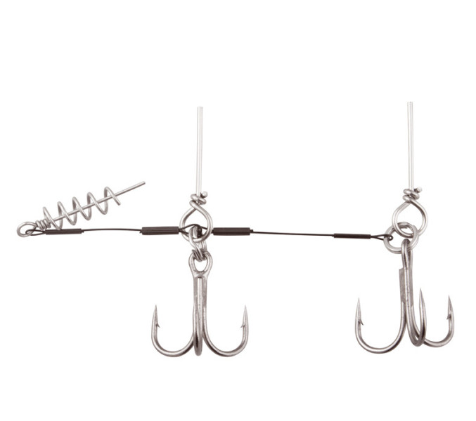 Montage complet : vis de montage + 2 hameçons sur bas de ligne acier pour armer les leurres souples de 20cm à 25cm.