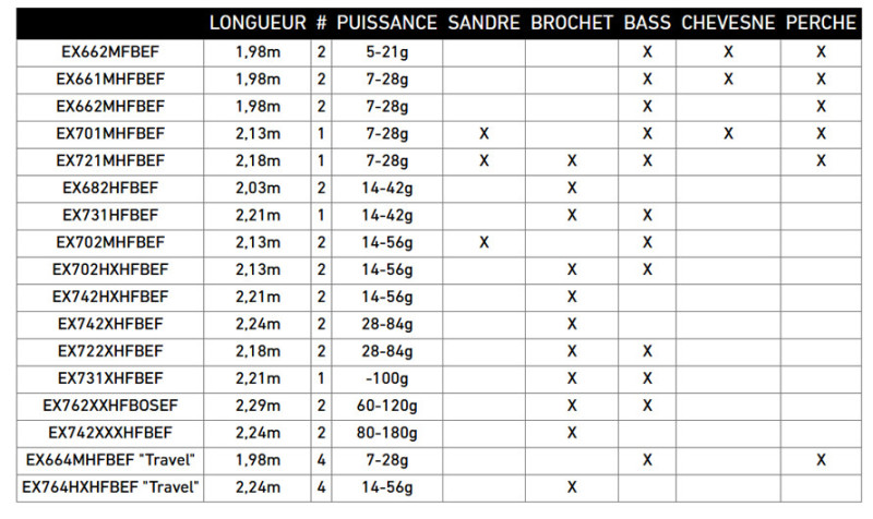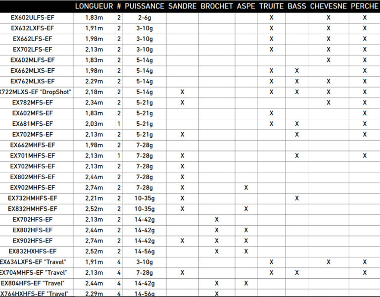 - Modèle EX634LXFSEF : Longueur 1.91m - Éléments 4 - Encombrement 53cm - Poids 90g - Anneaux 8 - Puissance 3-10gr