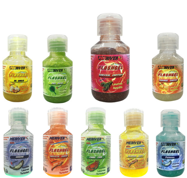 Disponible dans 9 parfums différents pour une utilisation aussi bien en eau douce qu'en mer : Calamar, Sardine, Crevette, Crabe, Ail, Anis, Poisson, Fromage, Écrevisse.