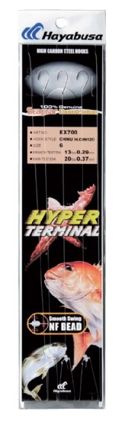 EX700 HAYABUSA : Sabiki montage à 3 hameçons ronds et renversés à pointe rentrante pour pêche de la daurade, ou maquereaux, montage sur fluorocarbone seaguar avec perle rotative à trous croisés, corps en 33,37,44,47/100ème et bas de ligne en24,29,33,37/100ème.