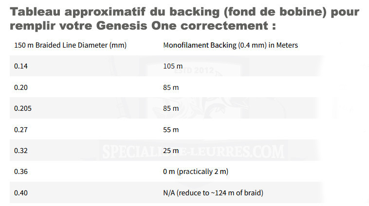- Tableau pour remplissage du moulinet et son backing disponible un peu plus haut dans les images. Nous vous conseillons d'acheter une bobine de 100m de nylon Invisible 3G 40/100ème pour votre backing.