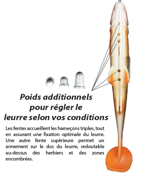 Cette version est conçue pour être armée avec un stinger (fournit dans le pack) et lestée avec des poids additionnels qui s’insèrent dans le corps (fournis dans le pack) ou une tête plombée vissable.