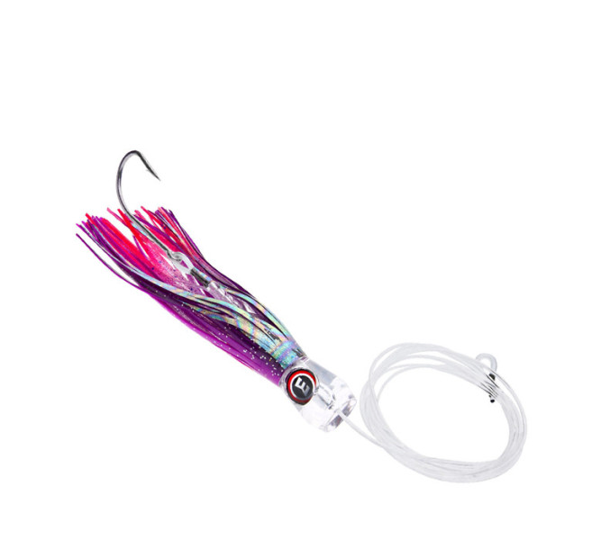 - Taille 11.1cm - 1 Hameçon simple VMC N°8/0 - Prémonté avec un bas de ligne nylon Sufix 1.5m de 130lb (58kg) - Jupe synthétique durable en feuille holographique incrustée - Vitesse de traîne jusqu'à 7 nœuds.