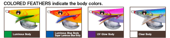 Plumes d'identification : L’Aurie-Q Longcast dispose de plumes de couleurs différentes pour reconnaitre en un coup d’œil les propriétés de votre Egi squid: