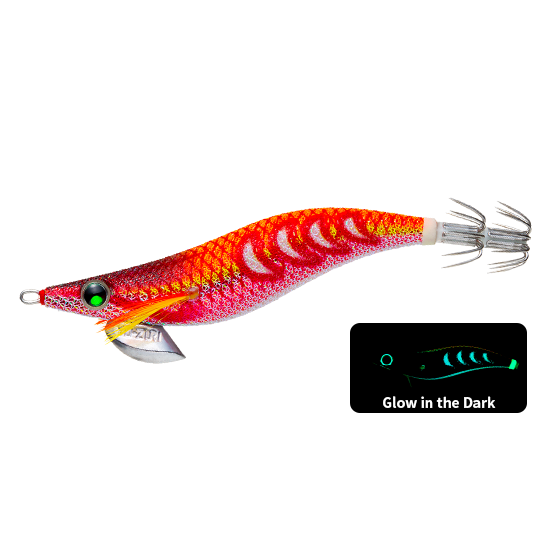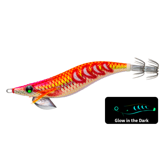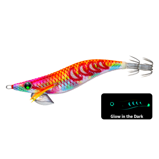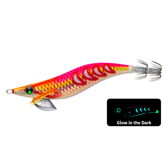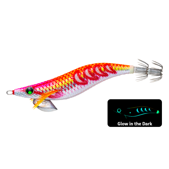 L'Aurie-Q  Search Double Glow est une turlutte dotée d'un corps émettant une double phosphorescence dans deux longueurs d'ondes différentes (Double Glow® Technology).